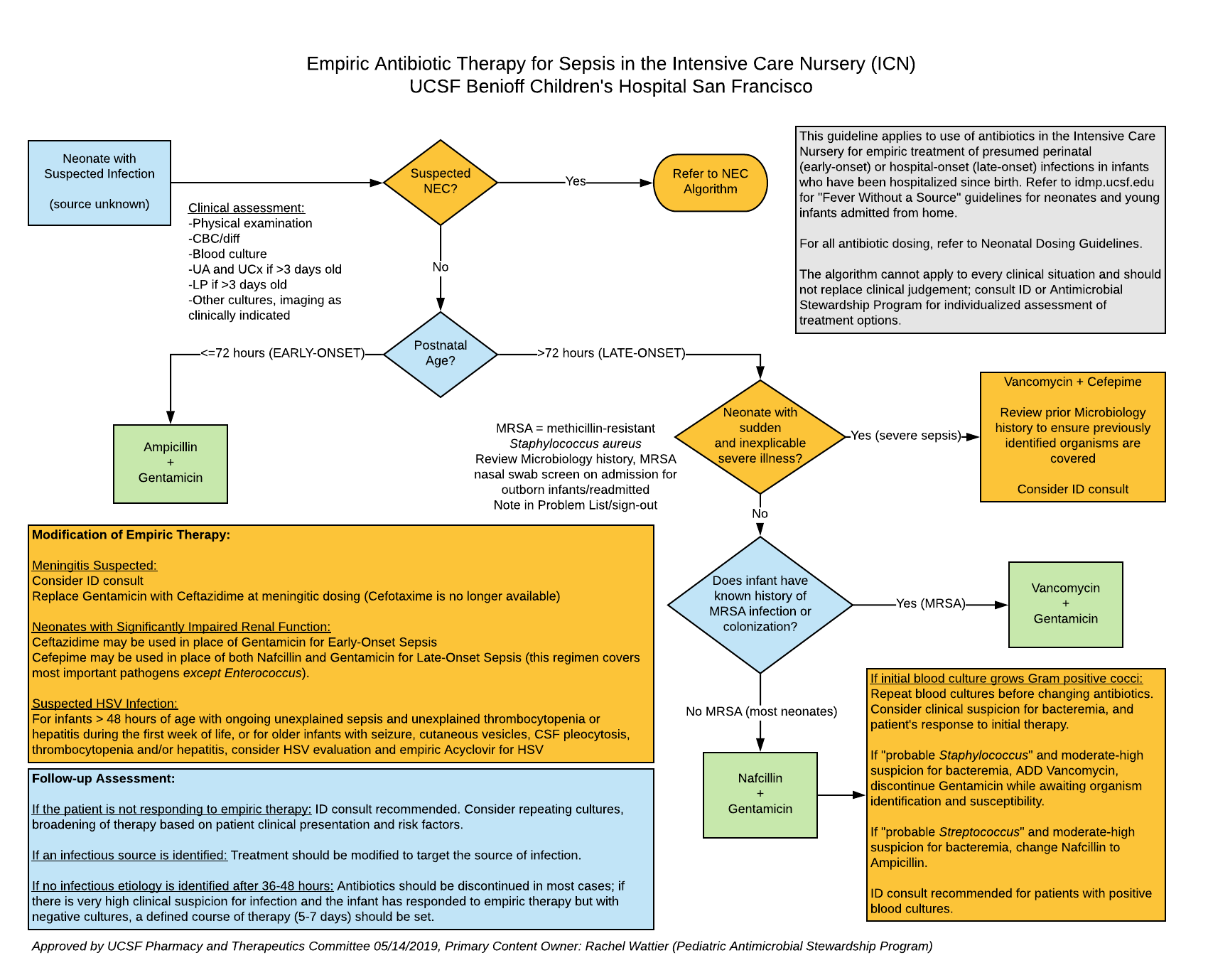 Initiated 2019. Content developed by Pediatric Antimicrobial Stewardship Program in collaboration with Intensive Care Nursery. Approved by UCSF Committee on Pharmacy and Therapeutics 05/14/19. Please direct questions about guideline content to [email protected].